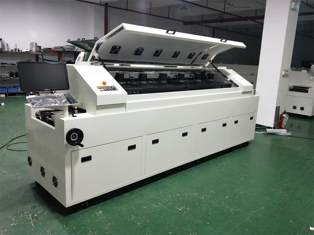 4. 加熱絲/加熱管加熱後,通(tōng)過(guò)風輪加速器運風攪拌,再通過風力分配器在區域內均勻(yún)分配,再通過多孔鋁板整流均風(fēng),保證熱量均勻、平衡(héng)的到達PCB. 開蓋方(fāng)式有兩種:氣缸頂升(shēng)開(kāi)蓋方(fāng)式+氣彈簧上蓋開啟方式.後麵設有維修(xiū)窗口,方便維修.